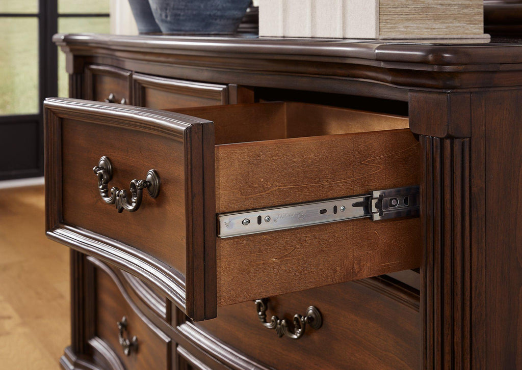 Take inspiration from the traditional luxury of this dresser. Classic with a rich cherry brown finish, its stately presence graces your room with an air of opulence. Your taste for exquisite details is satisfied with decorative drawer pulls and chic bun feet. With seven drawers acting as elegant hosts for clothes and other essentials, your restful retreat has never been so refined.
