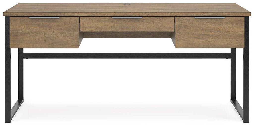 Sleek in its simplicity, this home office desk encourages you to work or study in style. Its mixed-material design brings a trendy, urban chic feel to your work area. Functional features keep the desk top clutter-free—easily tuck away essentials in the three drawers, and conceal power cords with the open raceway.